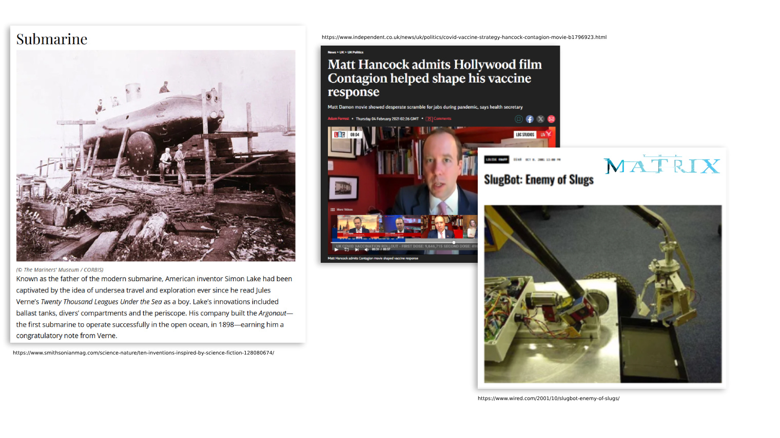Science-Fiction influences how we design technology (such as the submarine), invest in technology (such as vaccine rollout), and prepare for possible technology (such as The Matrix and SlugBot: Enemy of Slugs). It allows us to simulate and reflect on who we were, who we are, and who we want to be.